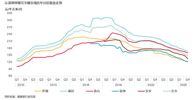 “降本增效”仍是企业职场策略当中最重要的考量因素,意味着在增量需求疲软的当下,控制成本并助力企业效率提升是撬动企业对办公物业需求的前提条件,这也预示在租户掌握主导权的市场中,“以价换量”仍将是主流趋势。受此影响,截至2025年四季度末,全市甲级写字楼平均租金向下调整至每月每平方米149.4元,较去年末下滑11.7%。