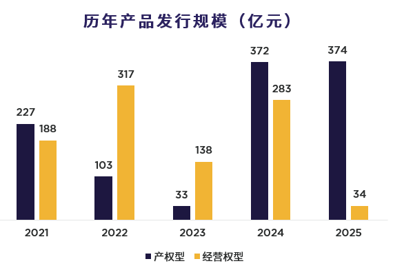 随着公募REITs从试点阶段进入常态化发行阶段,2024年、2025年审批及发行速度明显加快;截至2025年年底,境内公募REITs市场总发行产品数量达78单,总发行规模(含扩募)突破2100亿元。2025年产权类公募REITs市场发行数量为18只,经营权类发行数量2只。