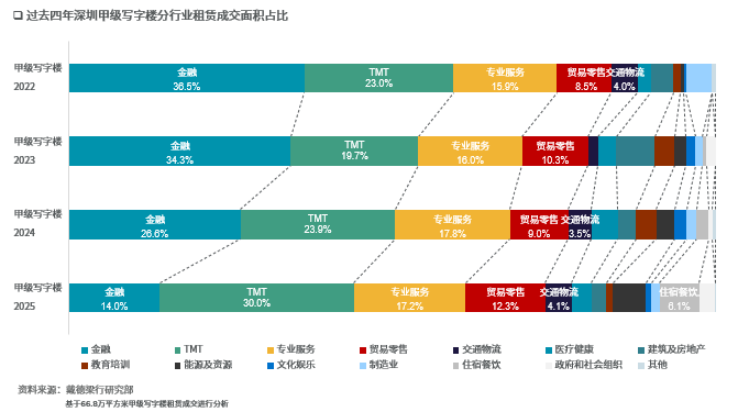 张晓端认为,尽管写字楼市场整体需求增长动能偏弱,但也涌现出一些结构性机会。TMT行业贡献了全年最多的甲级写字楼租赁需求,以租赁面积计占比约达总需求的三分之一。具体来看,AI产业的快速发展带动相关企业的租赁活跃度在2025年表现亮眼。而在业务扩张的驱动下,新兴的消费电子类企业亦有升级职场的需求,正逐步成为租赁需求的主力来源。