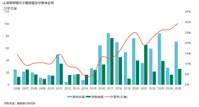 需求端来看,科技产业的发展正持续展现其对产业载体不断扩大的需求支撑。“十五五”规划建议明确将建设现代化产业体系列为首要任务,依托深圳在高新技术产业方面的扎实基础,人工智能、半导体、先进材料、生物制造等高科技产业的规模化扩容与能级提升,企业的总部布局、研发中心设立及团队扩张需求料将持续释放,有望为深圳写字楼租赁与投资市场注入增量需求。