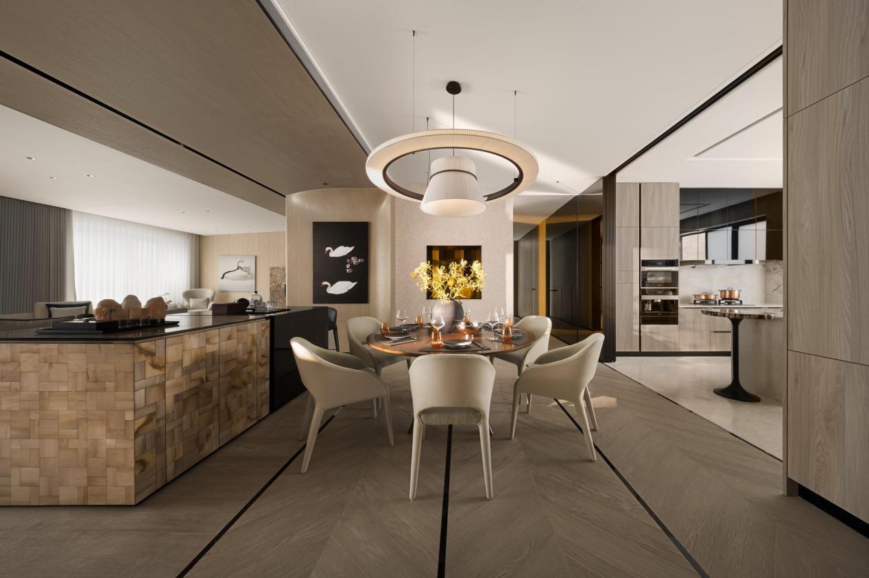 空间的“三维”特质,更赋予了生活充分的弹性。Eric Ho特别提到了客厅一侧的“隐藏空间”。“它可以是一个收藏爱好的酒窖,配备专业的储酒与醒酒功能;也可以通过一个小窗口,与餐厅形成视觉与气息的互动。”这个设计巧思,在动线上创造了家人之间不经意的交流机会。