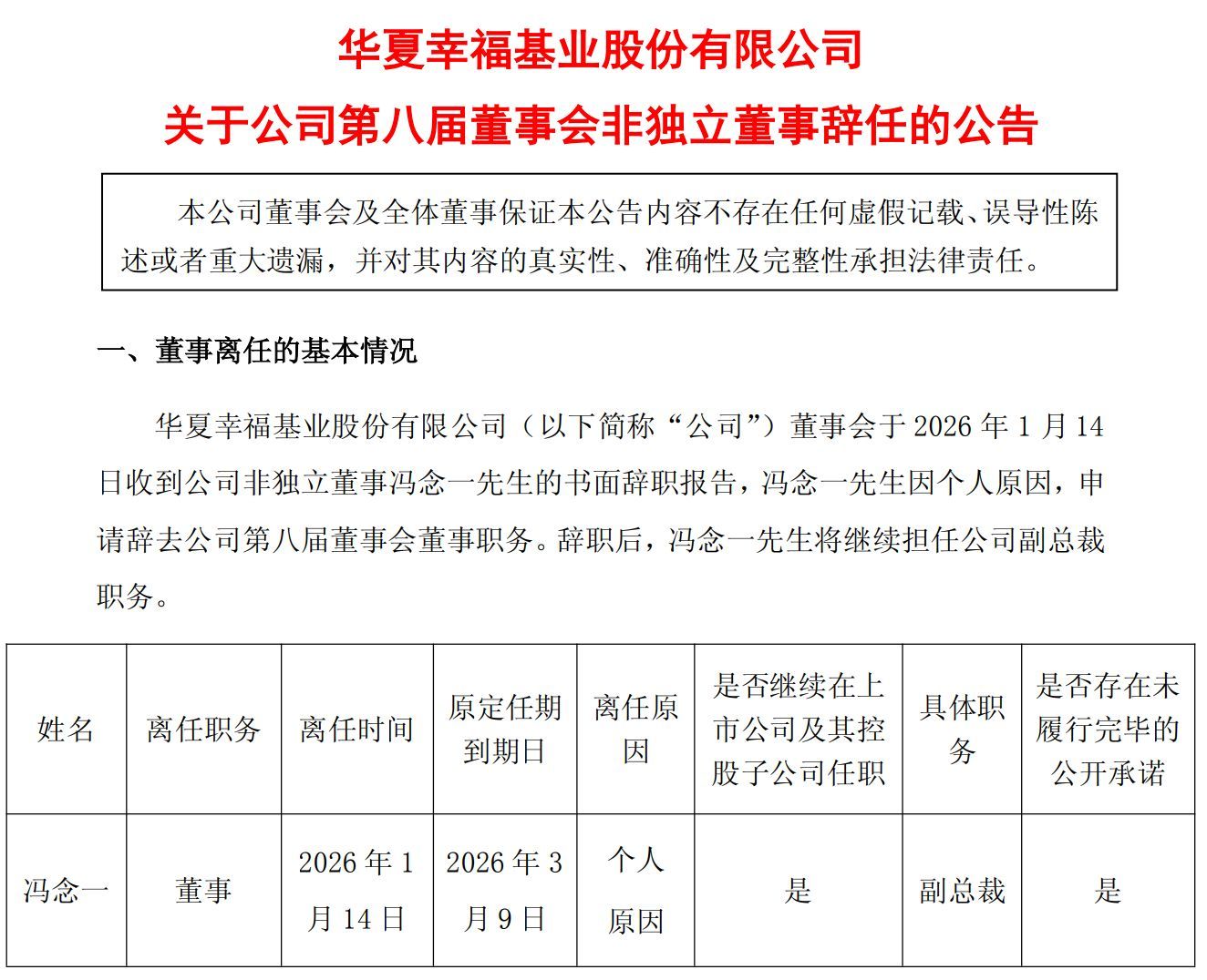 1月15日晚,华夏幸福(SH600340,股价1.76元,市值68.88亿元)公告称,董事冯念一因个人原因辞去公司第八届董事会非独立董事职务,辞职时间为1月14日,原定任期到期日为3月9日。