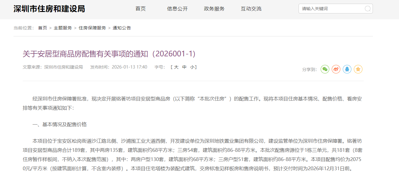 根据深圳市住建局发布的安居房配售通知显示,深铁铭著安居房项目已于2026年1月13日开启网上认购。
