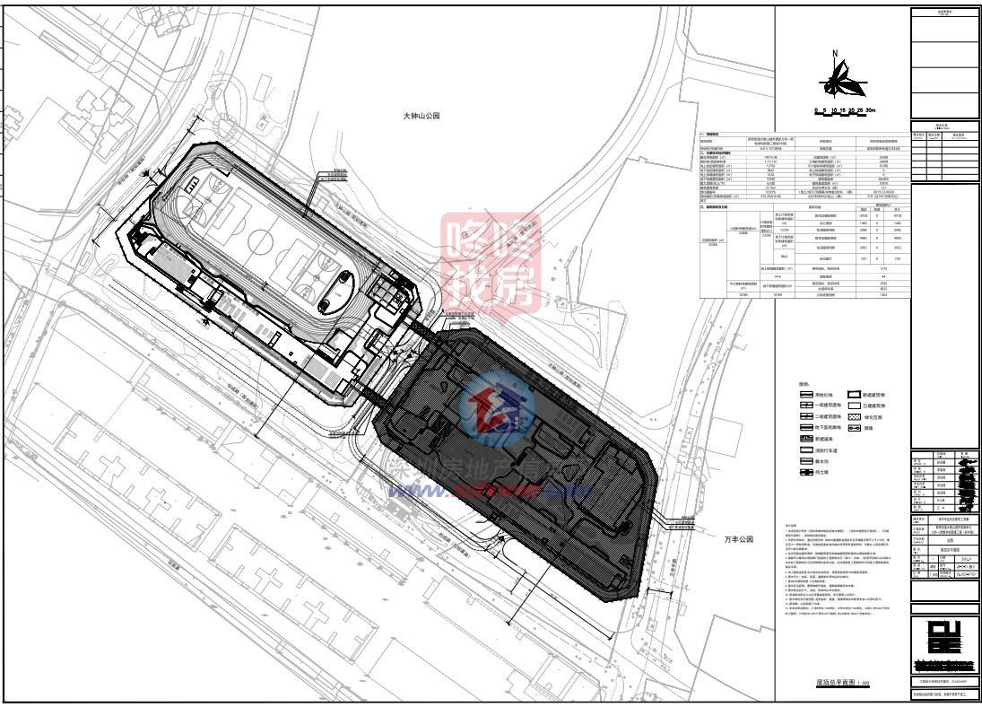 依据用地分宗情况调整宗地范围线。将运动场东侧下沉广场内的两部楼梯整体右移0.85米。根据设计深化及分宗后规划设计要点批复,对经济技术指标表进行调整: