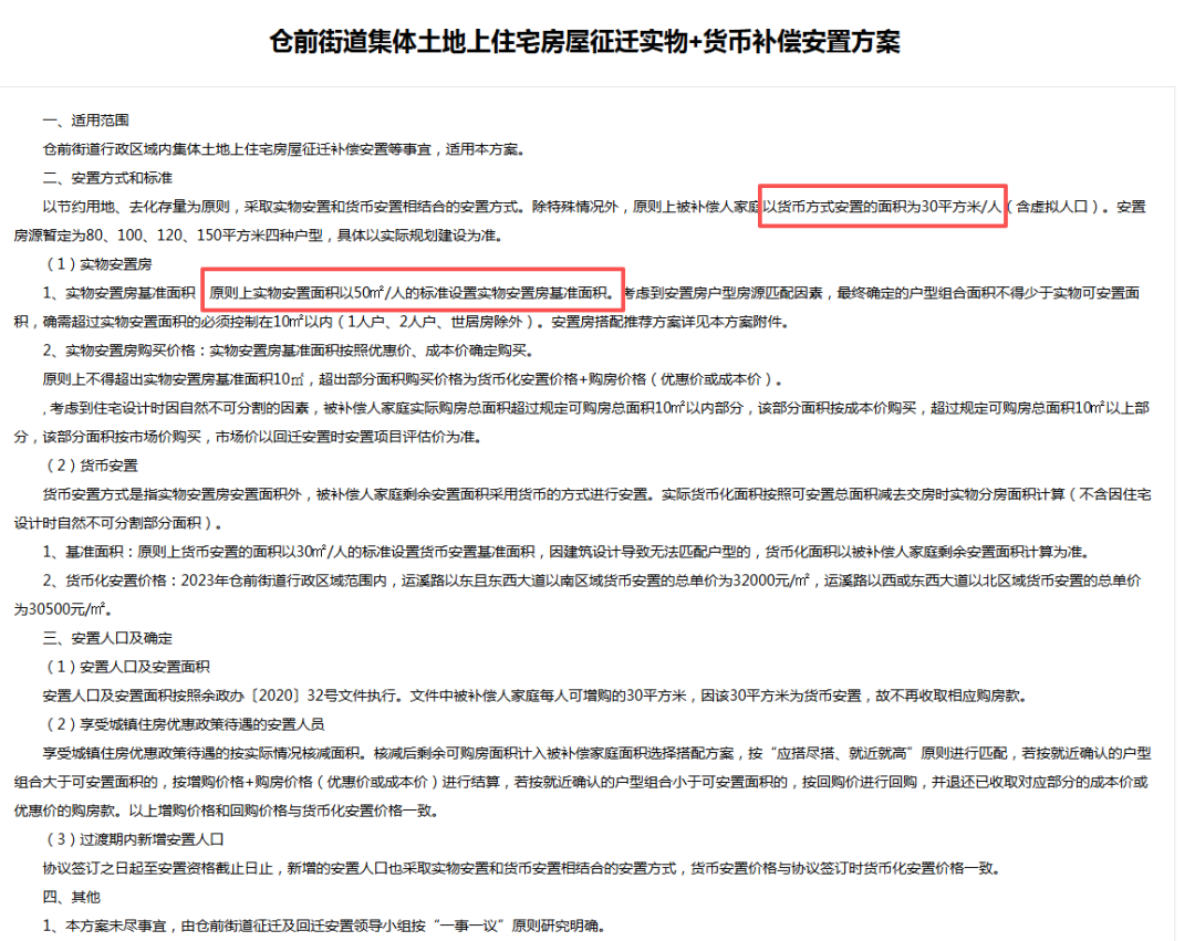 据官方发布的仓前街道补偿安置方案来看,连具塘村大概率继续延续余杭区较为成熟的“50 30”的安置模式,即参与征迁的农户可获得50㎡的实物安置房和30㎡的货币补偿标准。