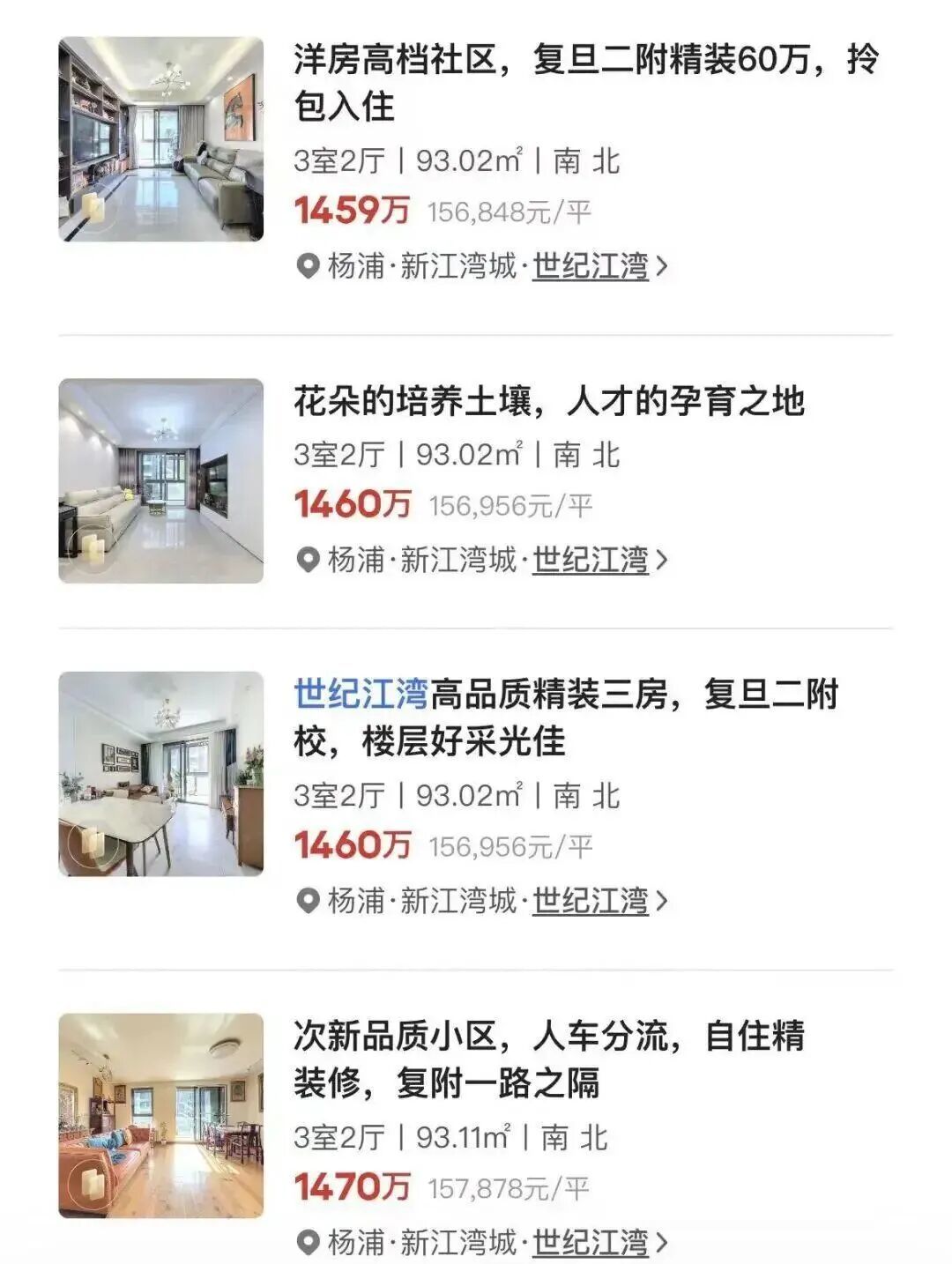 2025年11月,小区业主组成“保价联盟”,集体上调挂牌价。5套93平方米房源统一挂牌1460万元;2套67平方米房源则挂1230万元。