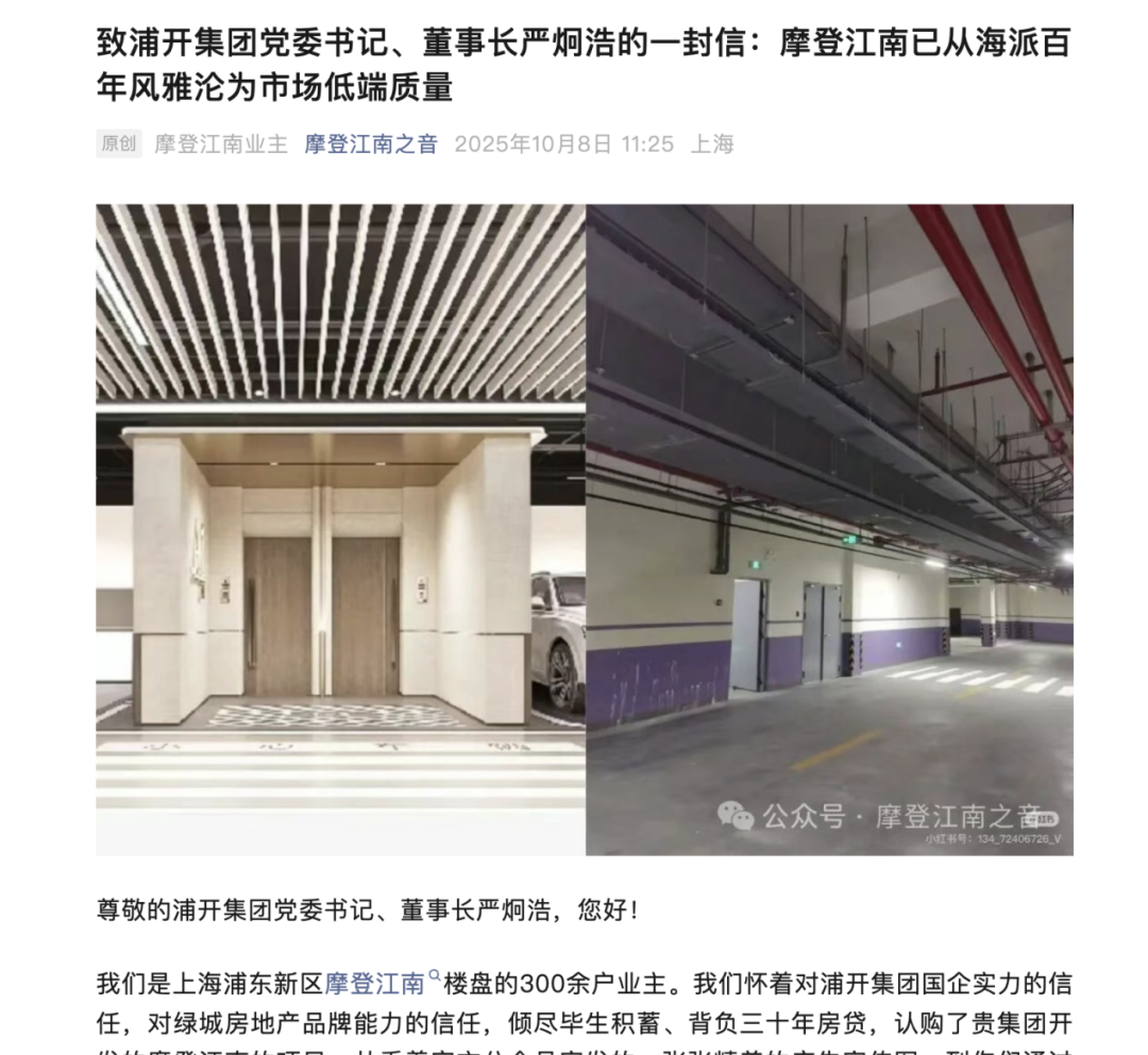 10月,他被浦开摩登江南的业主公开致信,点名要求解决项目问题。信中列出品质、交付、配套等一系列质疑,措辞激烈:“虚假宣传、偷工减料、降标减配……您的团队趾高气扬、充满傲气。”