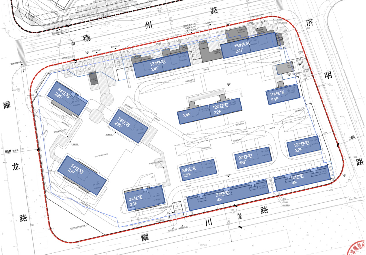 在市场最为关注的产品规划层面,此次公示也给出了明确答案。根据规划,项目将打造13幢住宅,涵盖低密与高层两种业态,以满足不同改善客群需求。其中,2幢4F联排住宅沿南侧耀川路排布,主打低密改善产品;另有11幢18-24F高层住宅。值得关注的是,5#、6#、7#三栋高层采用大角度南偏西设计,以此获得更优的瞰江视野。