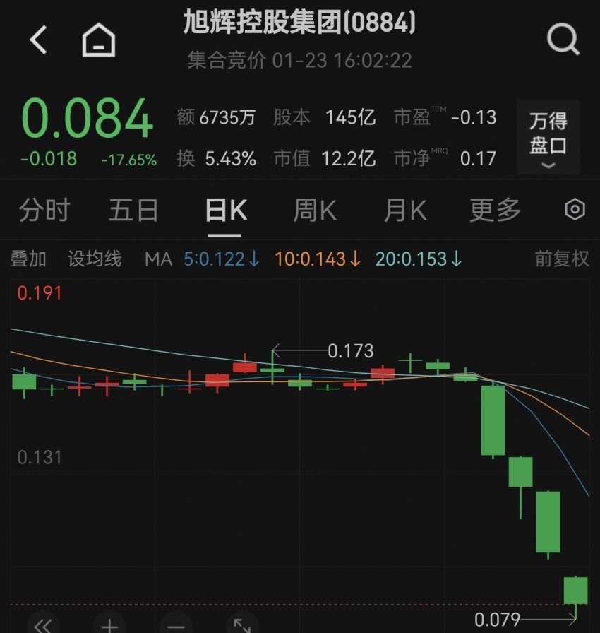 凤凰网风财讯:1月23日,旭辉控股集团(00884.HK)股价跌超17.6%,收报0.084港元,创上市新低。