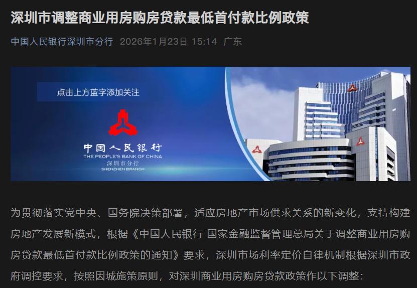 就在两日前(1月21日),根据人民银行广东省分行官网消息,将广东省(不含深圳)的商业用房(含“商住两用房”)购房贷款最低首付款比例调整为不低于30%,自2026年1月21日起执行。