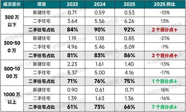 从总价结构来看,2025年北京新建住宅套均总价为750万元,同比上涨4%。总价1000万以上成交约7100套,同比增长16%。二手住宅在套均面积保持稳定背景下,因价格下降导致套总价回落至417万元,同比下降7%。2025年一二手住宅套均总价价差达到333万元,同比扩大21%。总价300万以下的二手房源成交约6.3万套,同比增长13%。