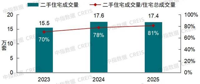 中指数据显示,2025年北京二手住宅成交17.4万套,交易量占全市一二手住宅总成交量的比重达81%,占据市场绝对主导地位。