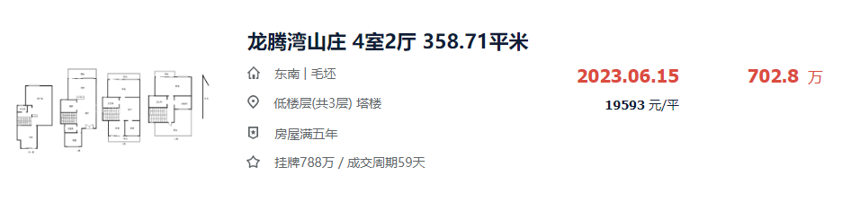 目前,该社区别墅挂牌价在1.5-5.7万元/㎡之间,最新成交房源为2023年1套约358㎡毛坯别墅,成交总价约702.8万,成交单价为1.9万元/㎡。