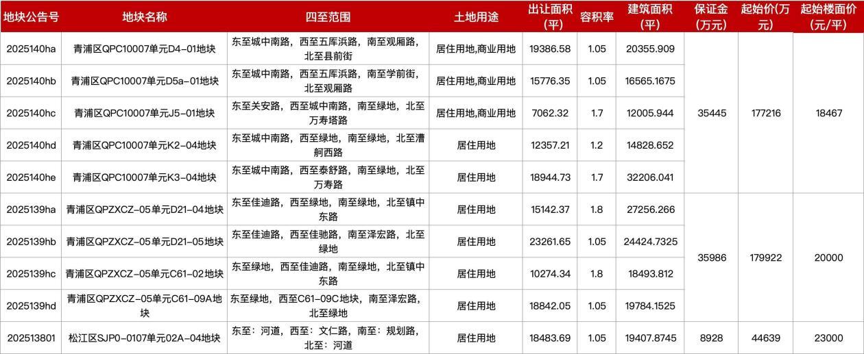 三幅地块分布于松江九亭、青浦新城以及青浦赵巷,总起价约40.18亿元。其中松江九亭地块起始价44639万元,起始楼面价2.3万/平;青浦赵巷组合地块起始总价179922万元,起始楼面价2万/平;青浦新城组合地块起始总价177216万元,起始楼面价约1.8万/平。