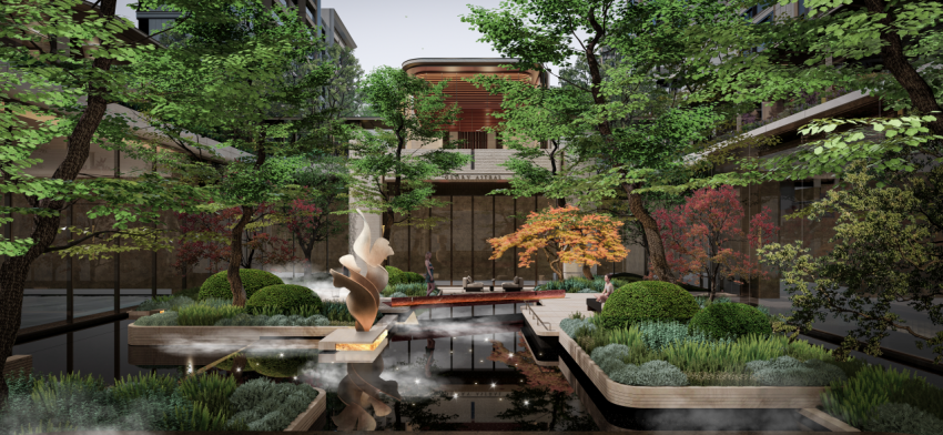 约1000㎡下沉庭院“森屿水榭”,红枫浮桥,营造可漫步、可静坐的立体画卷。