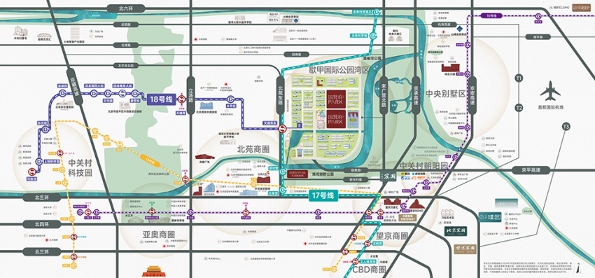 纵观世界级湾区的发展规律,“产业轴线 自然禀赋 高端人居”的黄金三角是其崛起的核心密码。北京歇甲湾板块精准复刻了这一发展逻辑,地铁17号线“产业价值金线”、地铁18号线“海淀科创线”于此交汇,依托北清路、北五环等横向主干道与立汤路、来广营北路等纵向轴线构建的“二横四纵”交通网络,实现与亦庄科创走廊、CBD总部集群、望京互联网高地、海淀中关村/上地科创产业群及未来科学城的无缝衔接,形成“南接繁华、北承科创”的黄金十字发展格局。