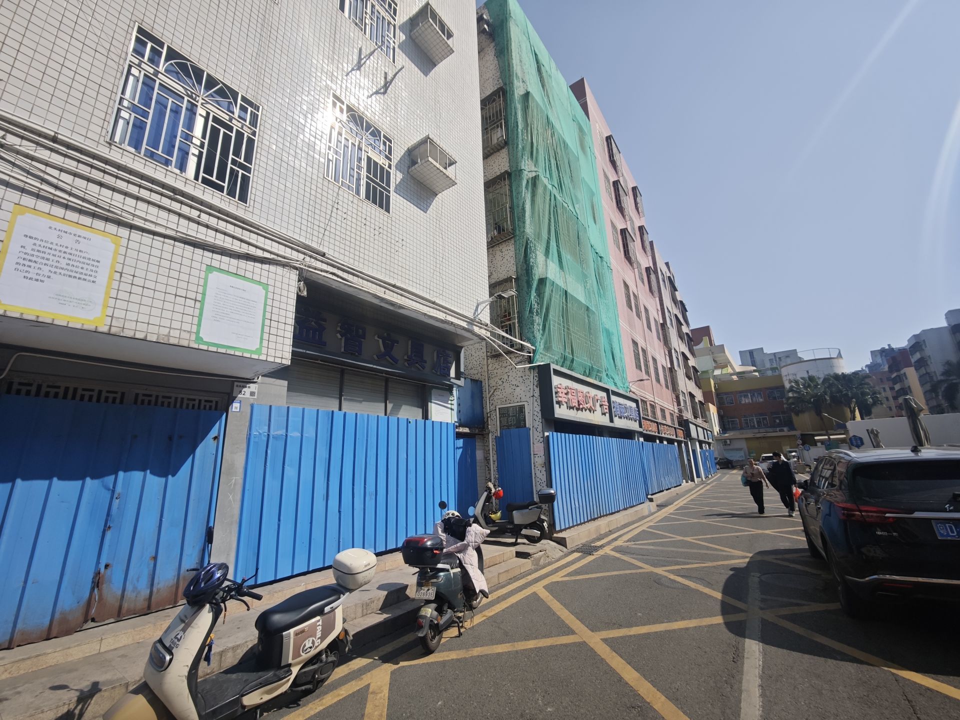 每经记者在现场看到,此前因旧改于2018年拆除重建的南山小学,如今主体建筑已基本完工。与新校舍一路之隔的,正是即将进入拆迁范围的楼房,不少楼宇已经拉起围挡。在街道一侧,一面醒目的红色旧城改造宣传墙十分显眼,上面印着“旧城改造齐参与 幸福家园共创建”的标语,旁边还张贴着“北头城市更新项目公示栏”,显示这里正处于旧改推进阶段。