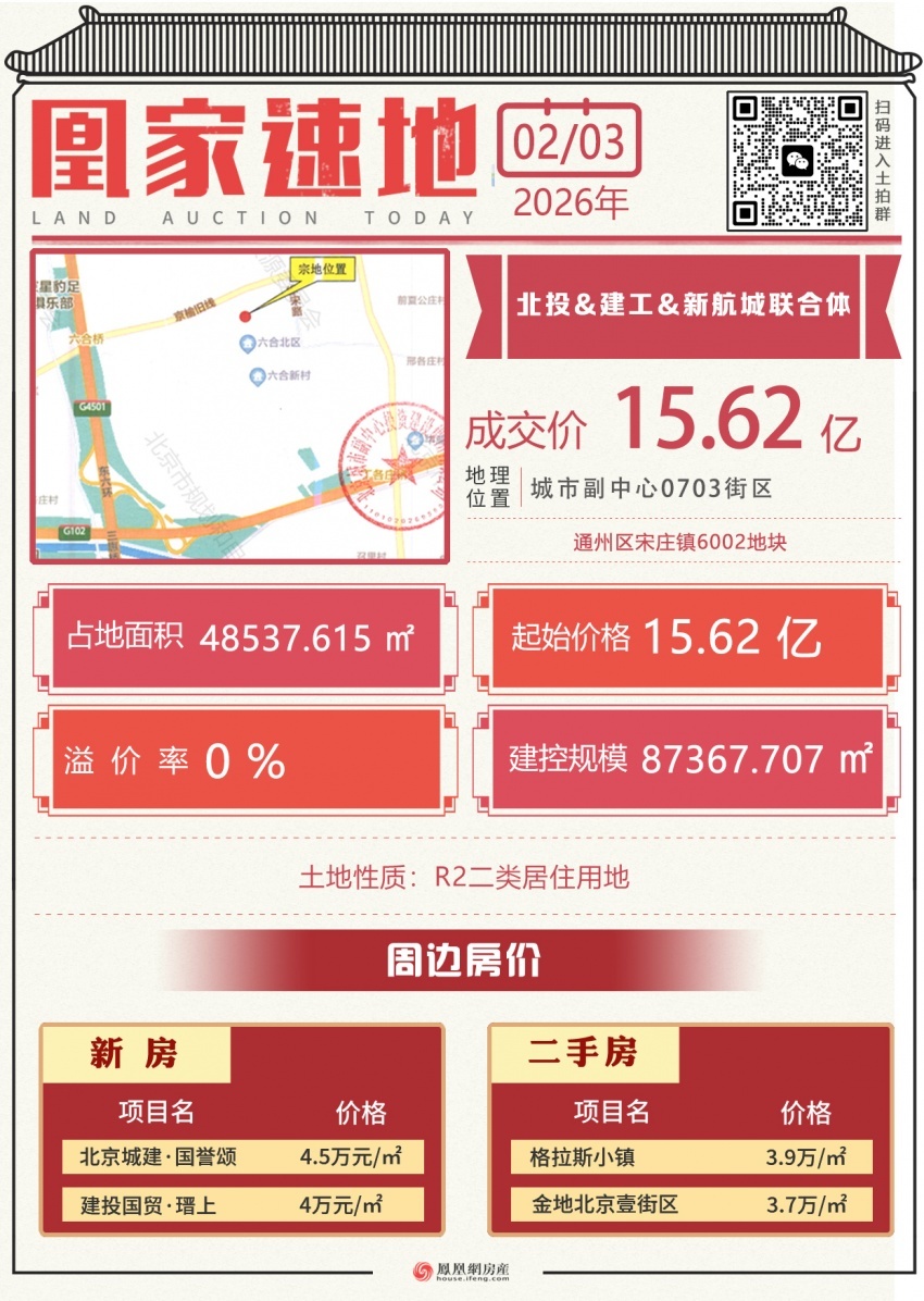通州宋庄四村城改项目6002地块由北投&建工&新航城联合体以15.62亿元底价摘得,楼面价约1.79万元/㎡。编号为京土储挂(通)[2025]049号,位于北京市城市副中心0703街区,土地面积48537.615平方米,建筑控制规模≤87367.707平方米,起始价15.62亿元。容积率1.8,建筑限制高度36米(局部45米)。