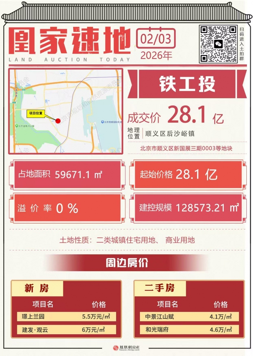 顺义新国展三期0003等地块由中国铁工投资集团以28.1亿元底价摘得,住宅部分折合楼面价约3万元/㎡。该地块包含3幅子地块,2301-03、04地块为住宅用地,05地块为商业用地。