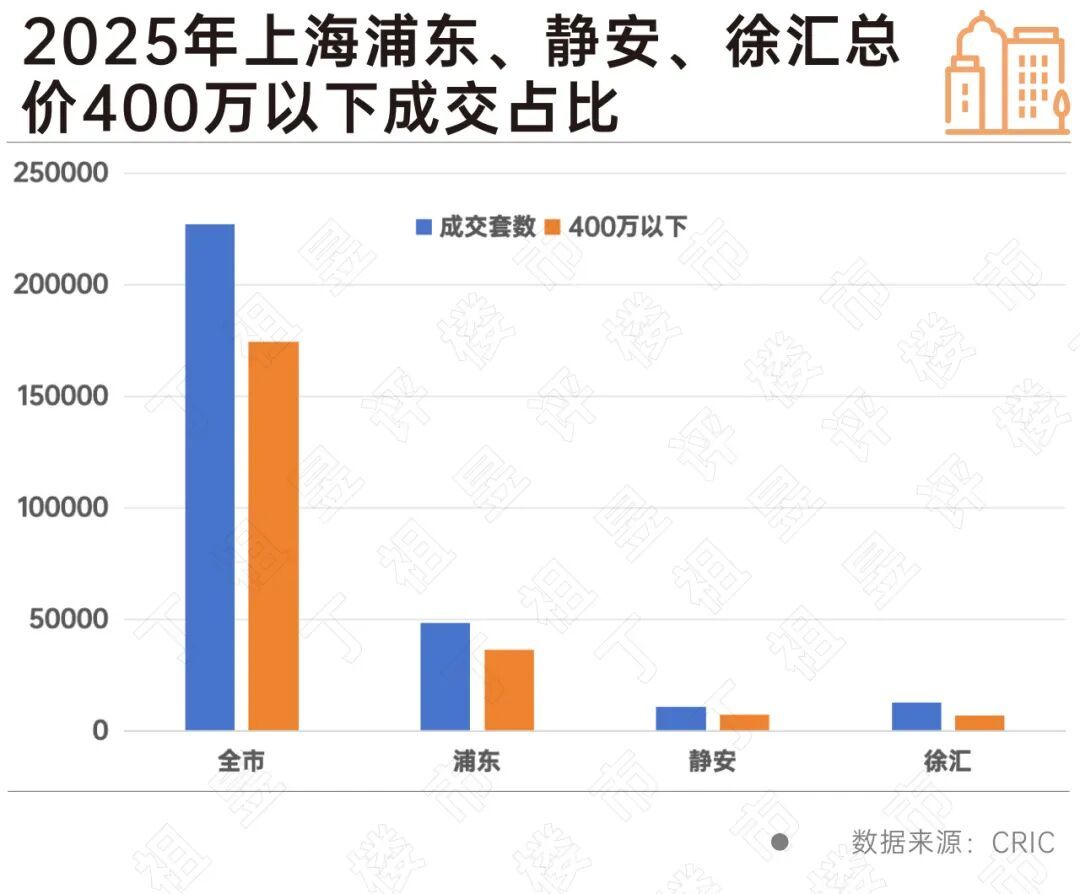数据显示,2025年上海二手房成交套数约227123套,其中总价400万以下成交占比达76.71%,浦东、静安、徐汇三区总价400万以下的成交占比都在50%以上,其中浦东达75.32%,静安达66.24%。