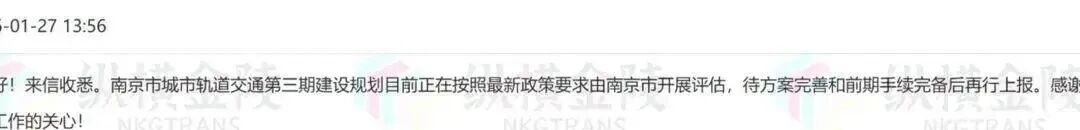 就在近日,省发改委回复问政信息:“南京市城市轨道交通第三期建设规划,目前正在按照最新政策要求由南京市开展评估,待方案完善和前期手续完备后再行上报。”