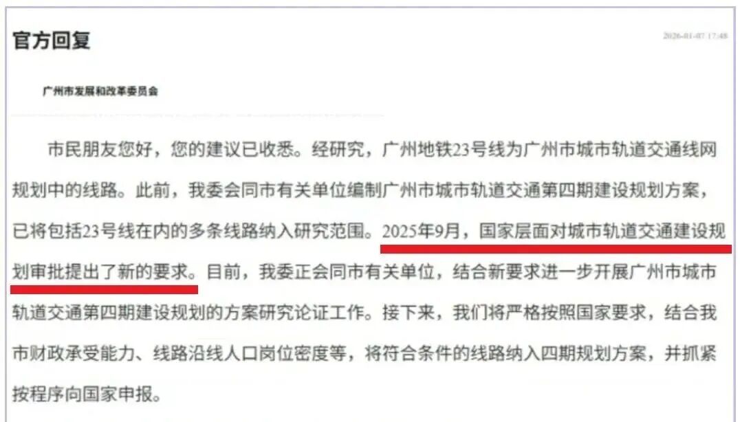 2026年1月7日,广州市发改委官方回复称,2025年9月国家层面对城市轨道交通建设规划审批提了新的要求,广州结合该市财政承受能力、线路沿线人口岗位密度等指标,重新修订了广州地铁四期规划方案。