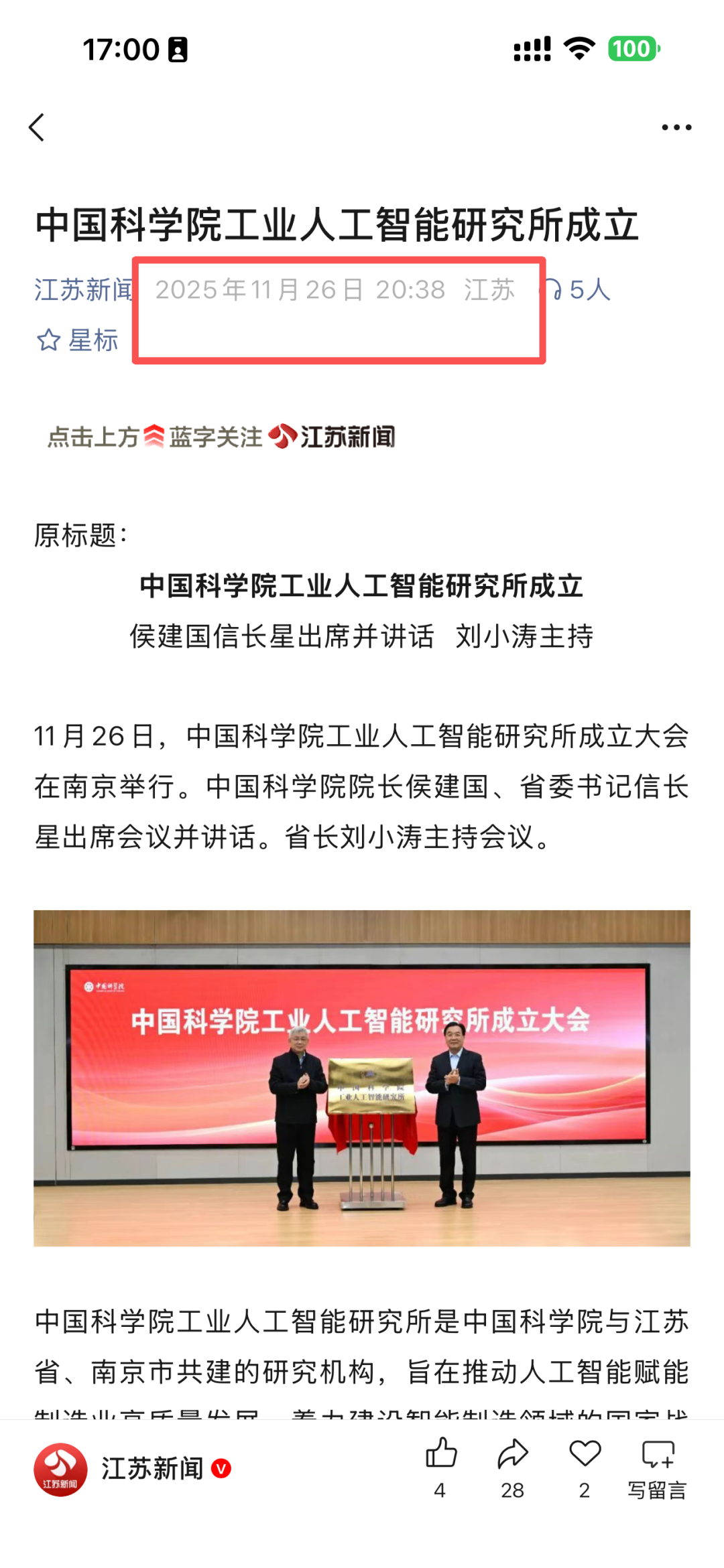 而就在前一天,2025年11月26日,省级官媒报道了中国科学院工业人工智能研究成立的专题新闻,重要领导出席,并明确提到江苏将为研究所发展提供全方位保障,推动省院合作不断取得新成果。