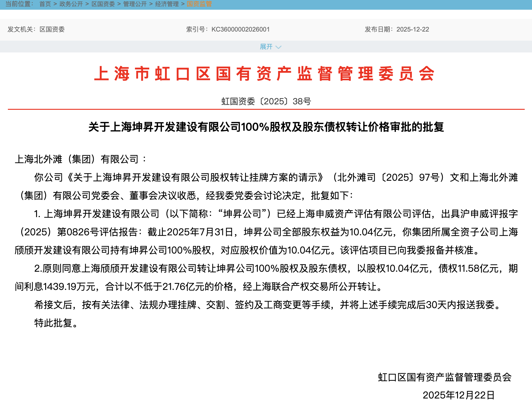 近日,虹口区北外滩一重要综合开发项目传出开发主体变更动向。该消息源于去年12月虹口区官网发布的一则批复文件,内容涉及上海坤昇开发建设有限公司100%股权及相关债权的公开转让。