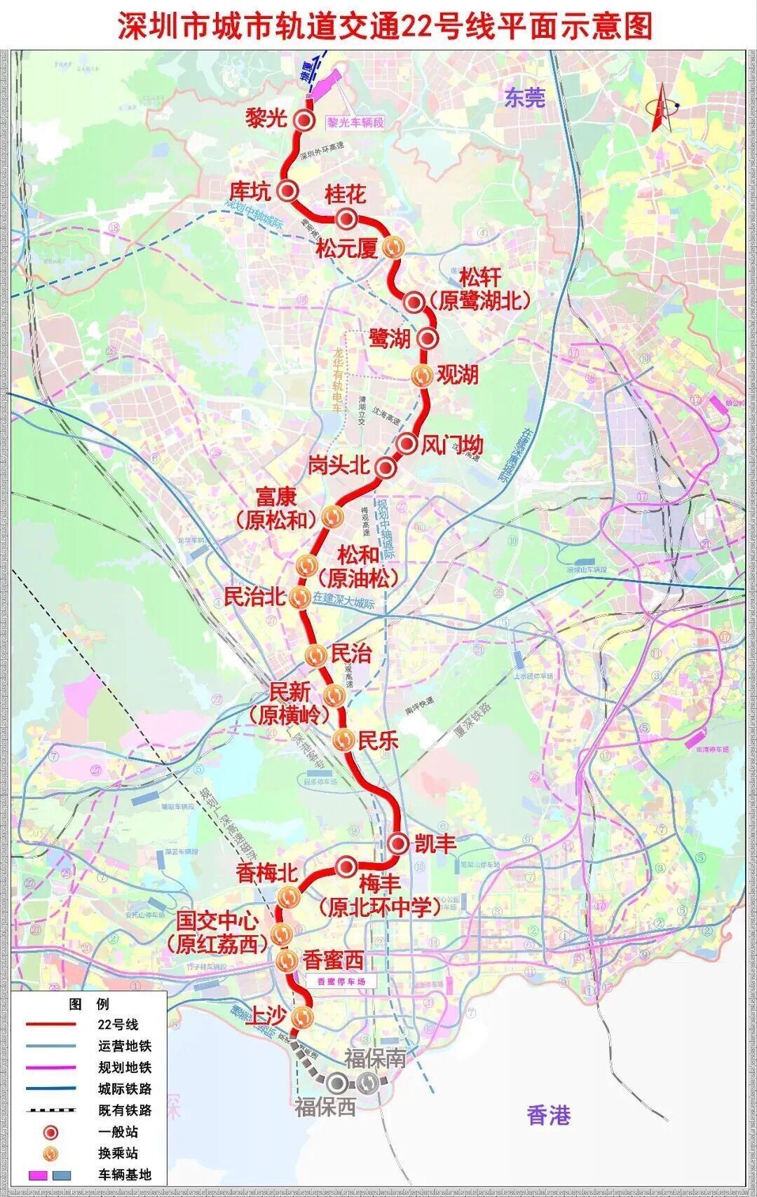22号线一期工程起于上沙站 ,途经福田区、龙岗区、龙华区,终至黎光站 ,线路全长34.7公里。设站21座,均为地下车站。