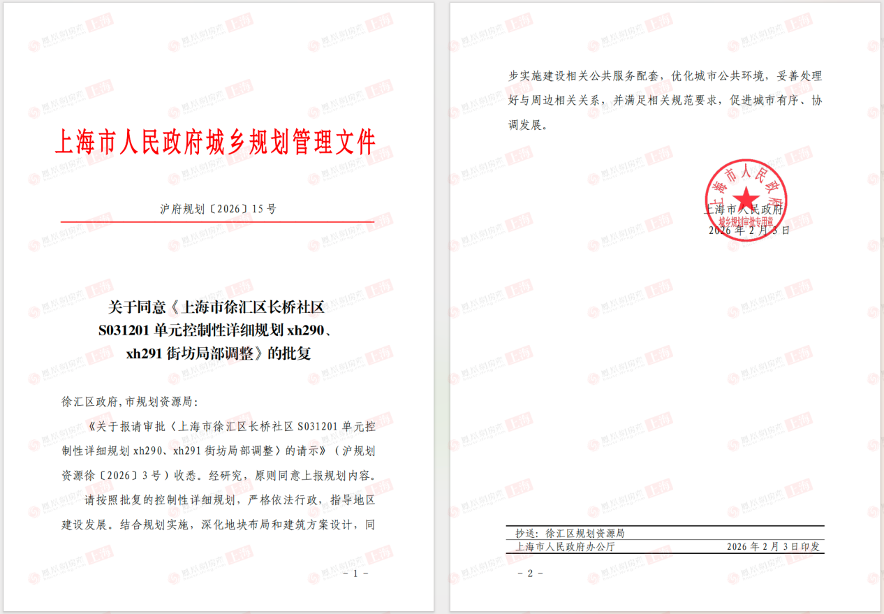 2月3日,《上海市徐汇区长桥社区S031201单元控制性详细规划xh290、xh291街坊局部调整》正式获得批复。这也标志着原规划为商业商办用途的xh290-09地块,正式转变为纯住宅用地,即将进入出让流程。