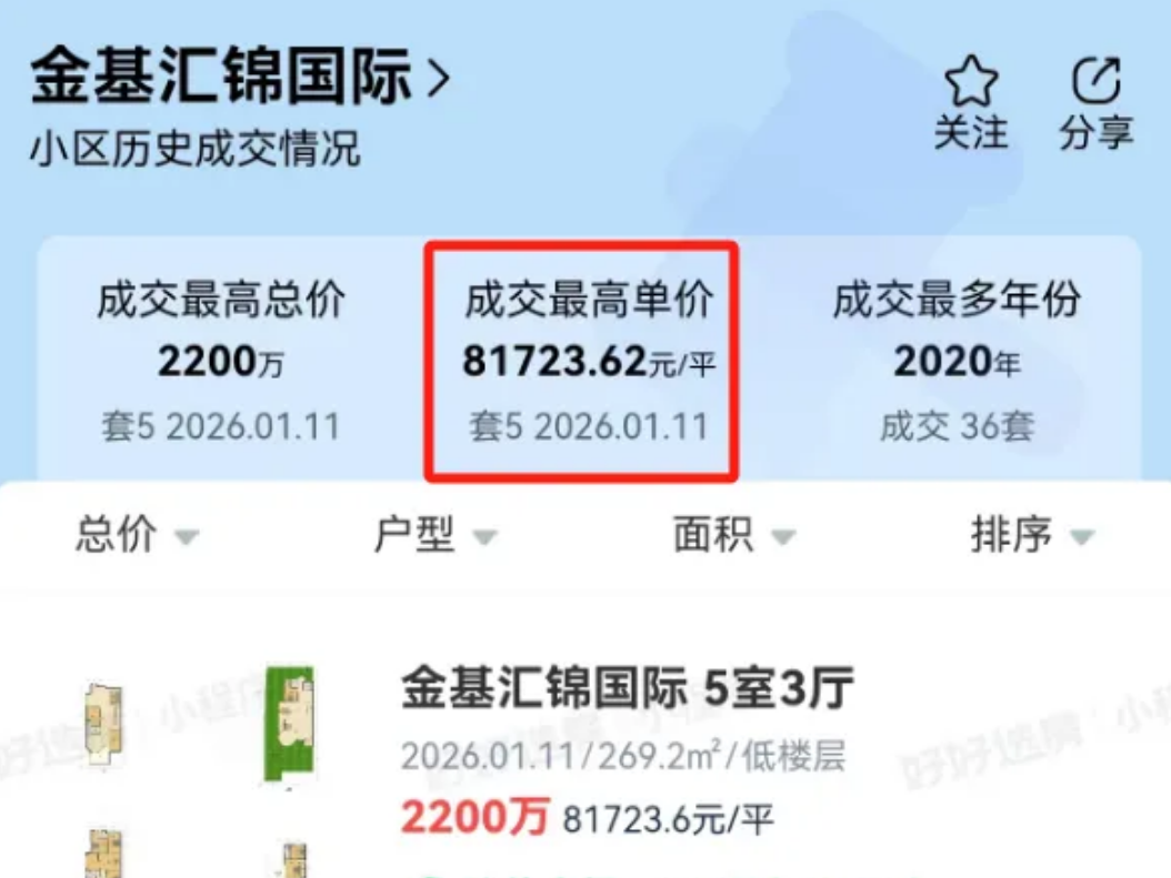 河西中金基汇锦国际,最新成交一套建面约269.2㎡5室3厅联排房源,总价2200万,成交单价约81723元/㎡,直接刷新了该小区成交单价纪录。