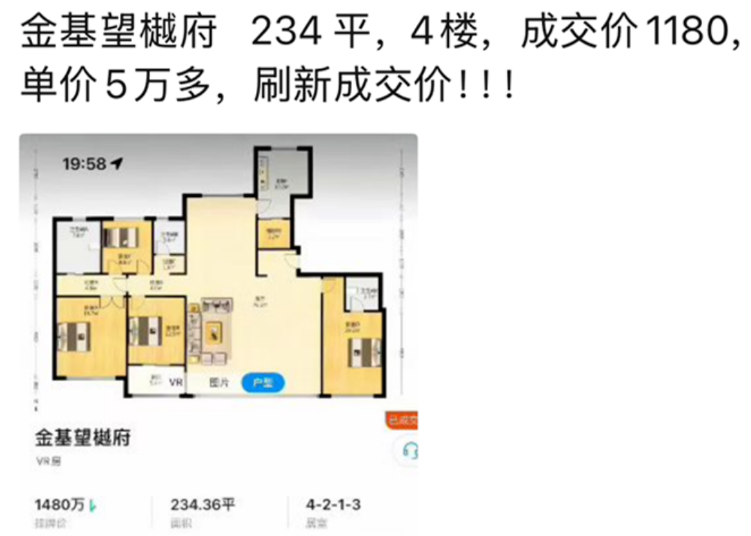 近日,位于南部新城的金基望樾府,成交了一套建面约234平米的大户型房源,成交总价1180万,成交单价高达5万多/㎡,刷新了该小区的成交总价纪录。