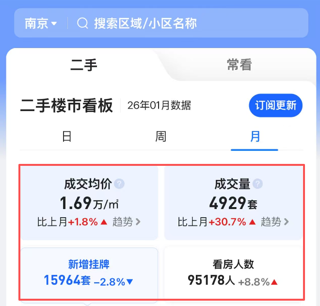 同时,贝壳数据显示,1月南京二手房成交均价1.69万/㎡,环比上涨1.8%;成交量达4929套(仅贝壳平台),环比大幅上涨30.7%。同期看房人数95178人,环比上涨8.8%,新增挂牌减少。