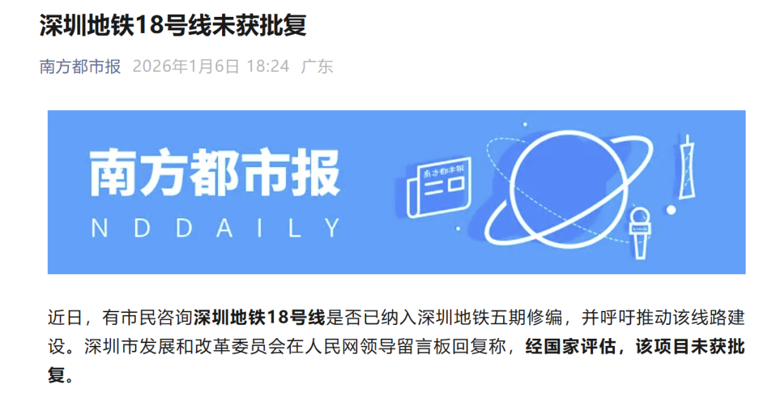 如,此前深圳市民咨询地铁18号线是否纳入五期修编时,深圳市发改委回应称“经国家评估,该项目未获批复”。