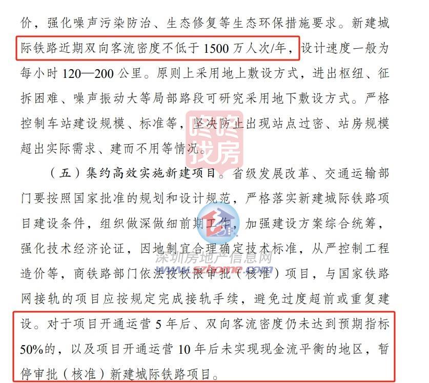 明确提出,对于项目开通运营5年后、双向客流密度仍未达到预期指标50%的,以及项目开通运营10年后未实现现金流平衡的地区,暂停审批(核准)新建城际铁路项目。