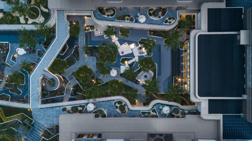 社区内部园林则汲取秦岭自然意境,构建了“三脉六景六园”峡谷度假景观体系。“六景”之中,浮丘门厅、流岛叠溪、观澜栈桥、青林垂瀑、山涧一线天等景点错落布局,营造出步移景异的峡谷谧境。
