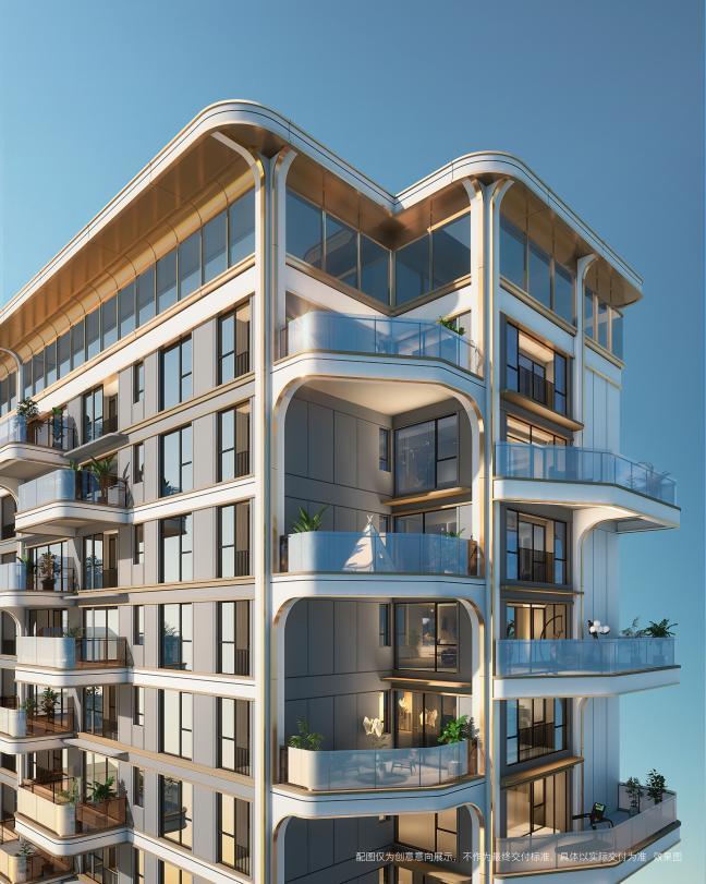 辅以香槟金的铝板勾勒线条、米白色和高级灰的真石漆奠定沉稳基调,再搭配市面上主流的大面积玻璃,不仅引光入室,更营造出通透轻盈的公建化现代美学立面,历久弥新。