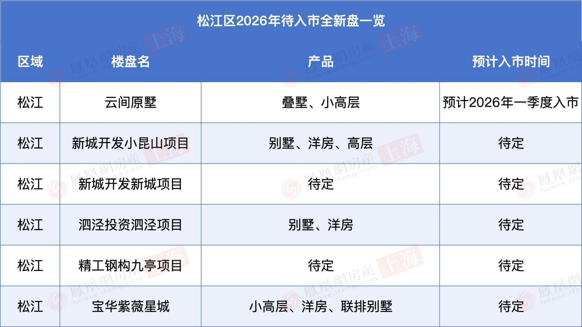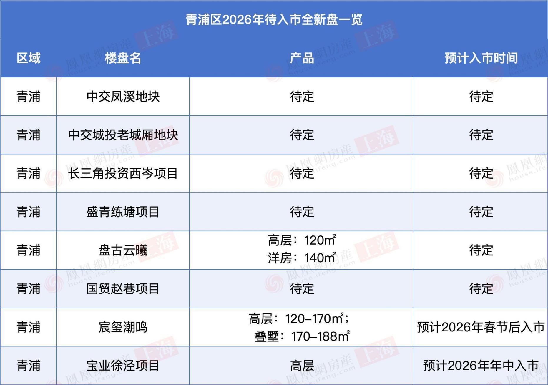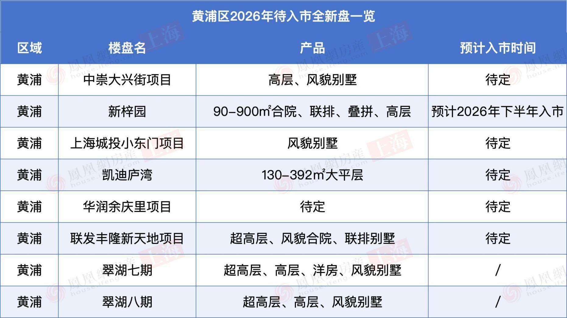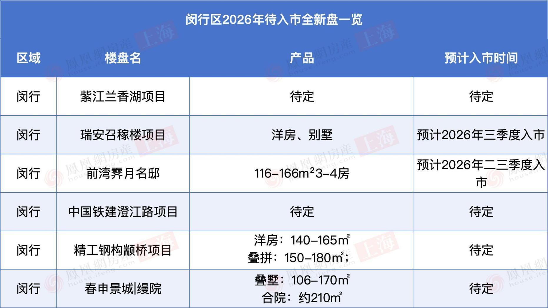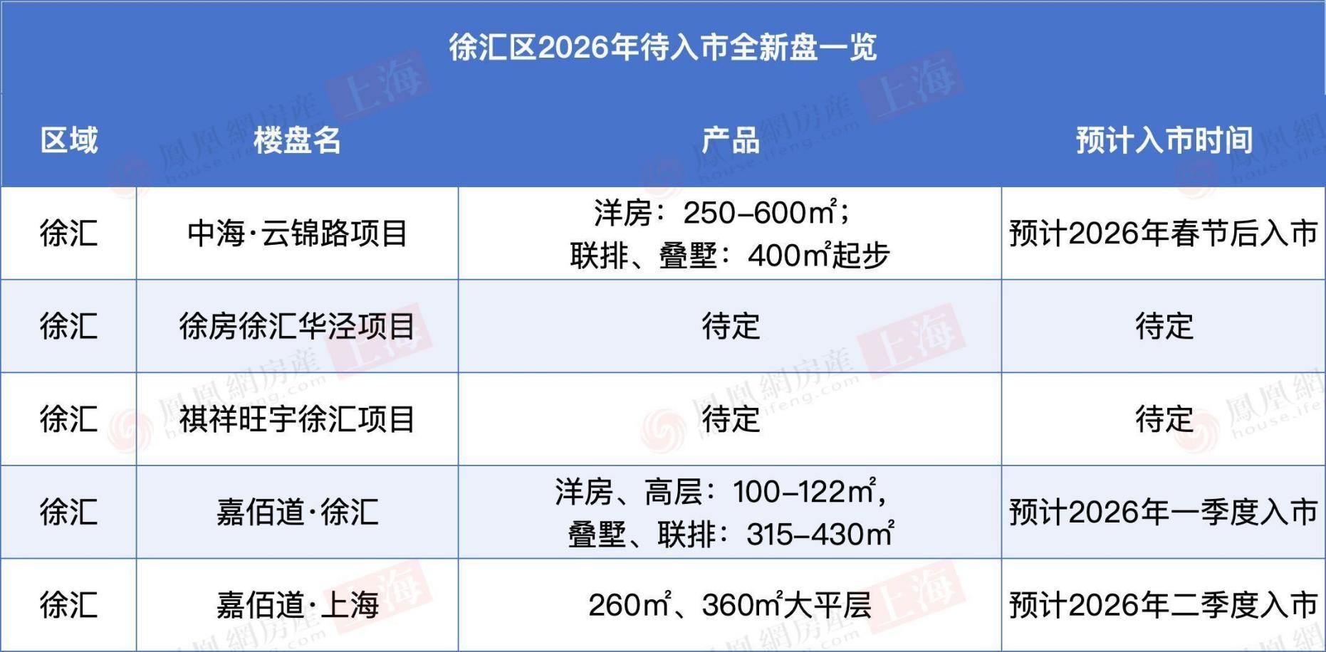 徐房徐汇华泾项目、祺祥旺宇徐汇项目信息待定。