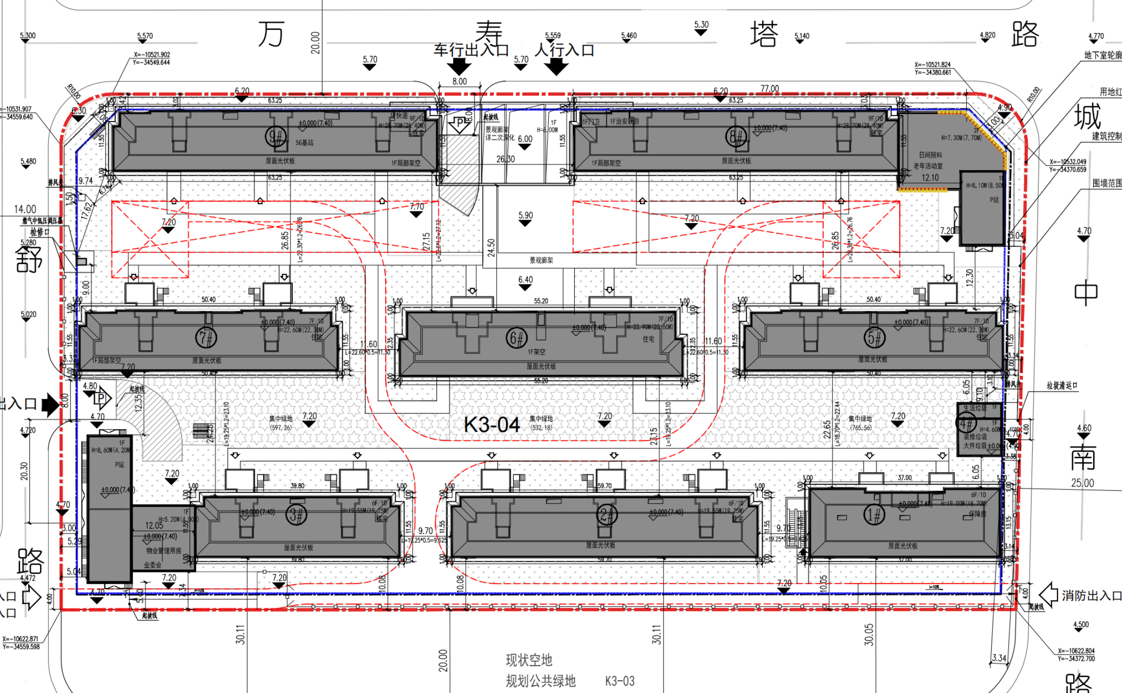根据方案,K3-04地块拟建7栋6-9层住宅,其中1、2、3#楼为地上6层,5、6、7#楼为地上7层,8、9#楼为地上9层;4#楼为地上一层,东南角另设1栋6层保障房。部分楼栋设置局部架空层,地库为地下一层。