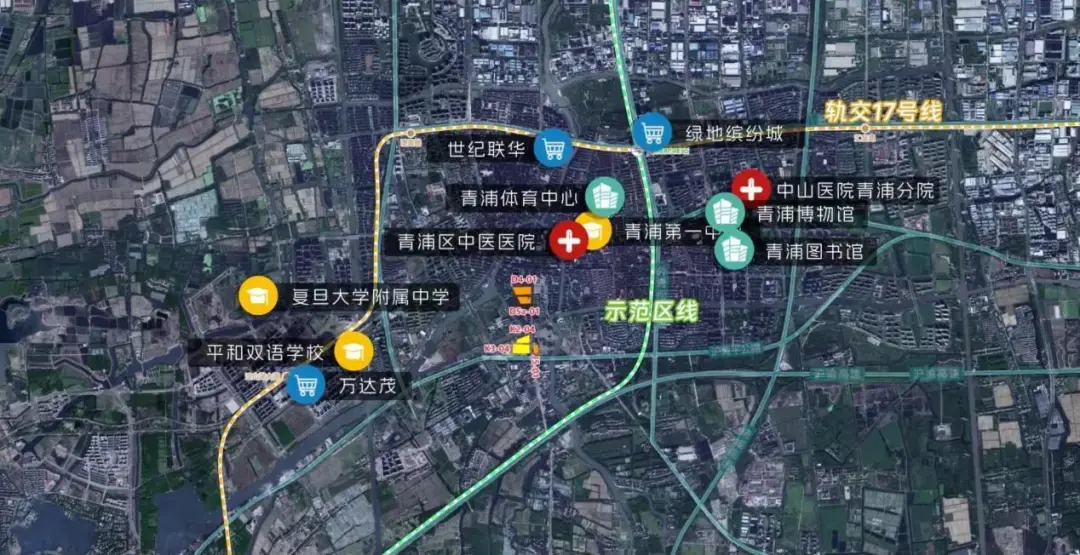 从区位来看,项目位于青浦老城厢,紧邻沪青平公路,交通路网成熟。虽距轨交站点有一定距离,但距示范区线青浦新城南站约1公里,短途接驳后仍具备较好的通勤条件。周边生活配套亦较为完备:教育方面有青浦区实验小学多个校区;医疗方面,青浦区中医医院、复旦大学附属中山医院青浦分院已投入使用,在建中的复旦大学附属中山医院国家医学中心(青浦新城园区)将为区域医疗能级带来进一步提升。