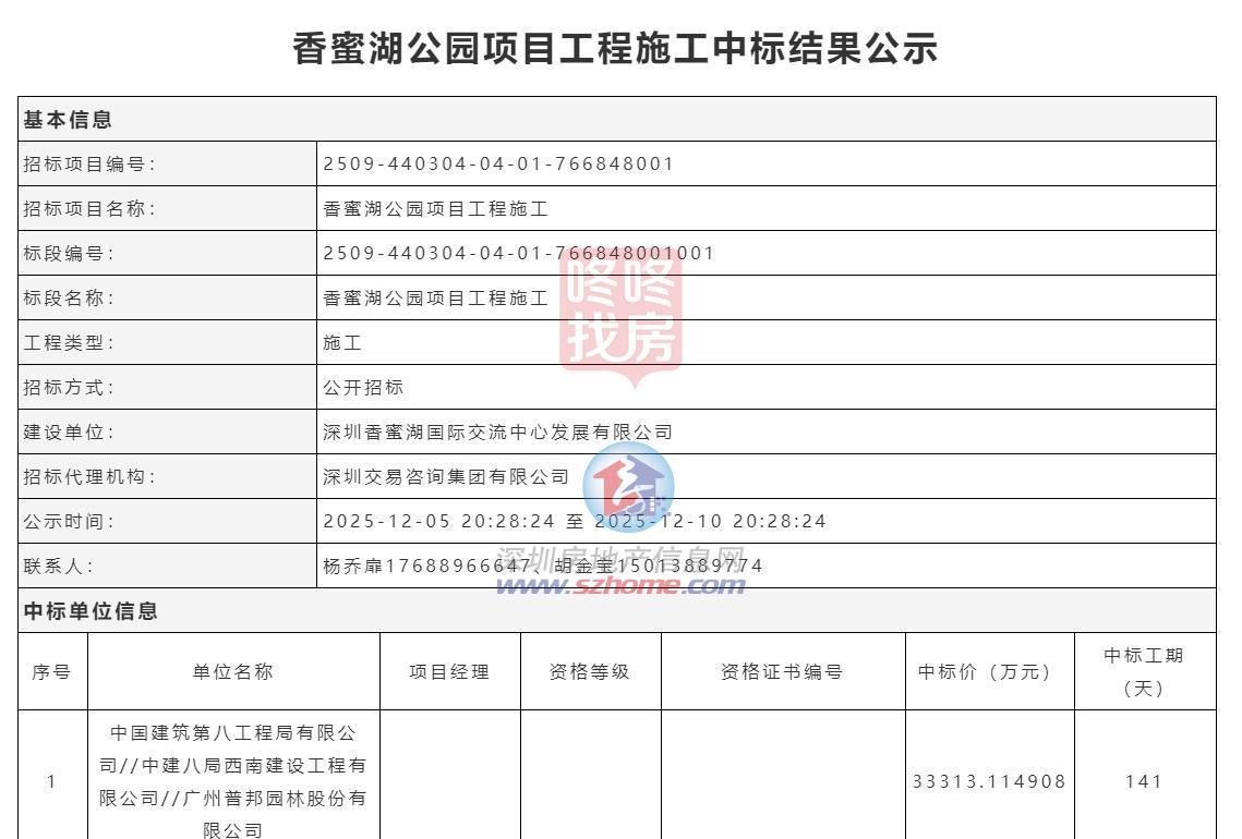 在2025年12月,深圳香蜜湖国际交流中心发展有限公司发布香蜜湖公园项目工程施工中标结果,该项目由深圳香蜜湖国际交流中心发展有限公司主导,计划总投资4亿元,由中国建筑第八工程局联合体中标签约,中标金额约3.33亿元,施工工期为141天,预计将于2026年内全面建成。