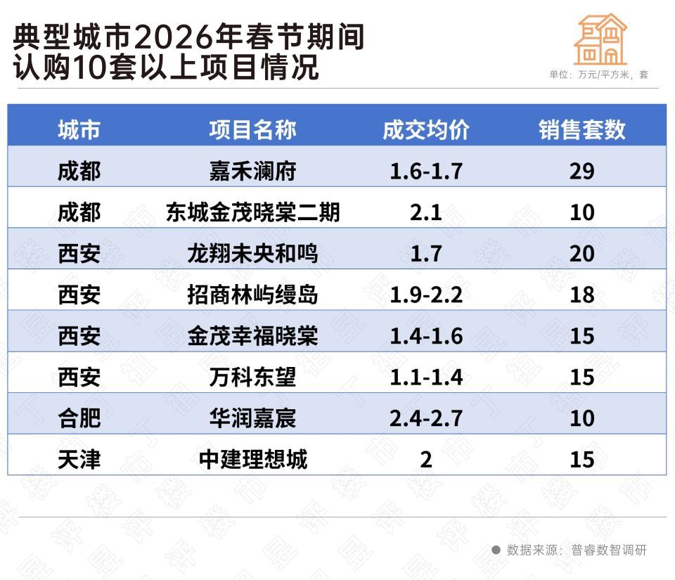 从具体项目来看,典型的案例有成都的新盘嘉禾澜府,春节前加推63套房源新规房源,春节期间认购29套位居认购榜首位;西安的龙翔未央和鸣,地段、产品优势加持,2月初首开效果好,春节再次加推实现20套认购量。