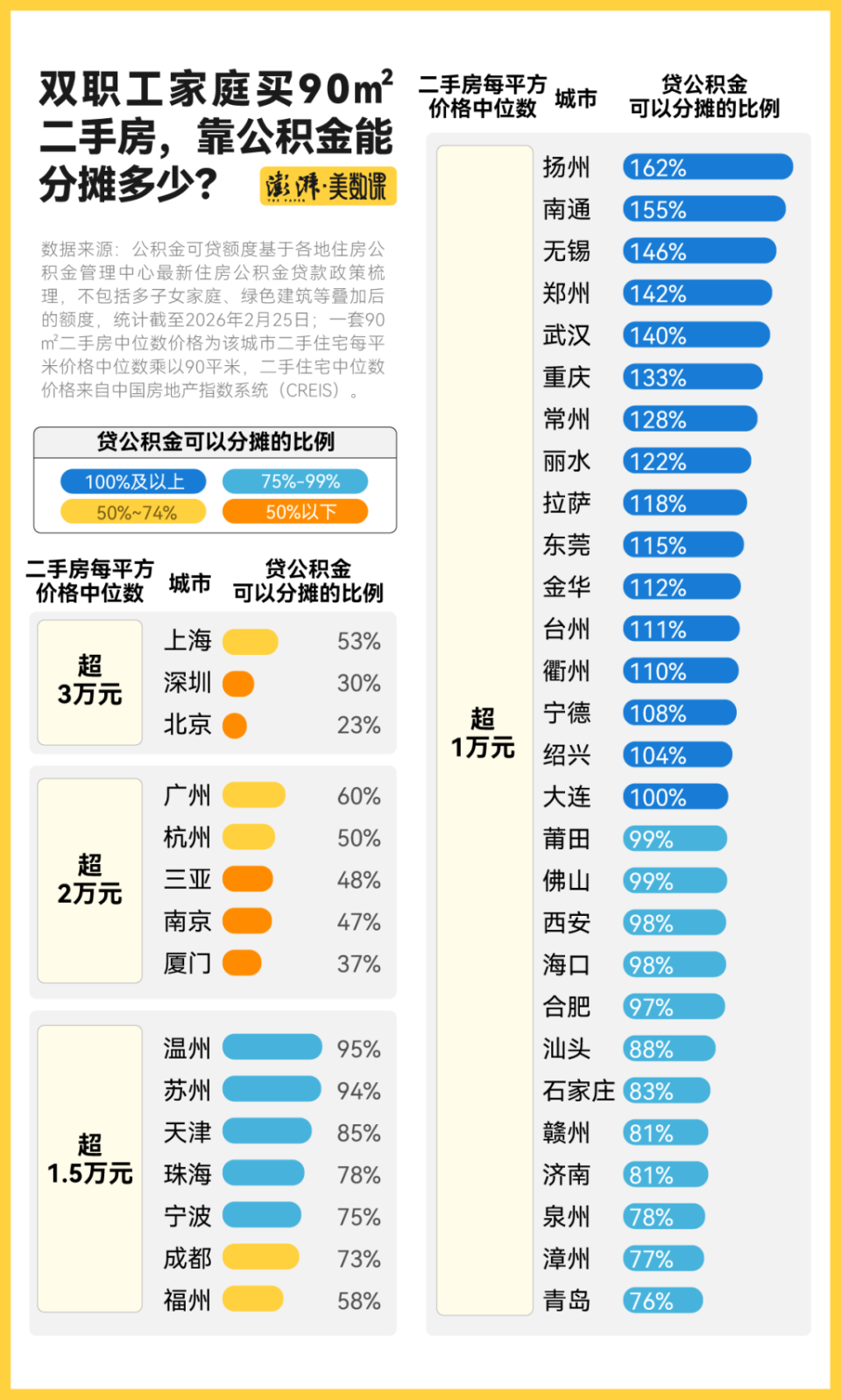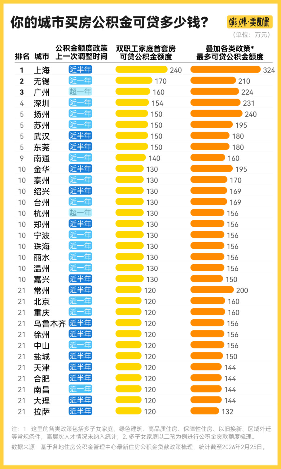 澎湃美数课工作室梳理,目前全国至少已有32个城市将双职工家庭首套房可贷公积金额度设置为120万元及以上,其中有8个城市的额度达150万元。