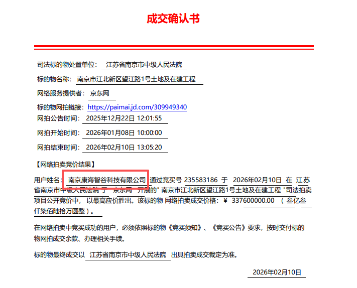 自2025年年中踏上法拍之路以来,这座命运多舛的巨型综合体,其起拍价从最初的约6.59亿元,一路下调至5.273亿、4.219亿。终于在2026年2月10日,以近乎腰斩的价格——3.376亿元,被南京康海智谷科技有限公司成功收入囊中!
