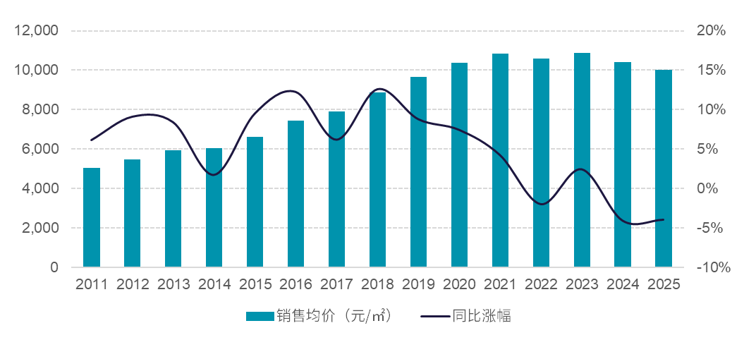 2025年全国新建商品住宅销售均价为每平方米10,005元,同比下降4.0%。伴随“好房子”供应的推进及其相关政策的宣传,多地新供应项目中高端改善型住宅产品的比例也明显增加。即便不少项目销售价格高于市场平均水平,亦取得较好的销售成绩,对当地住宅市场信心带来正向影响,但仍未扭转整体价格回调的趋势。