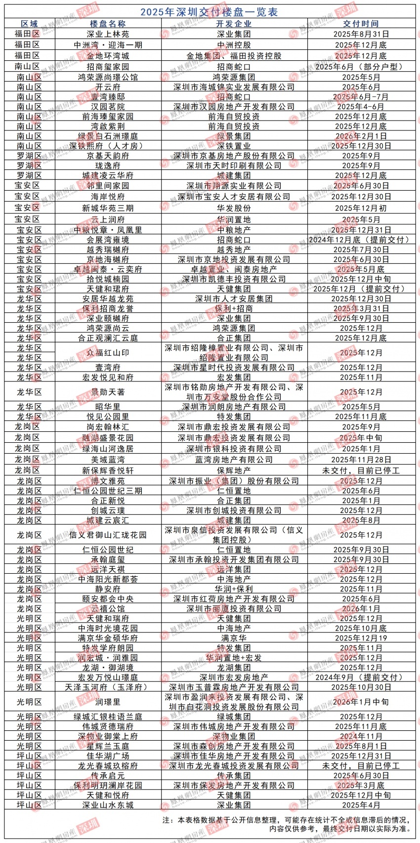 以下为2025年深圳交付楼盘一览表: