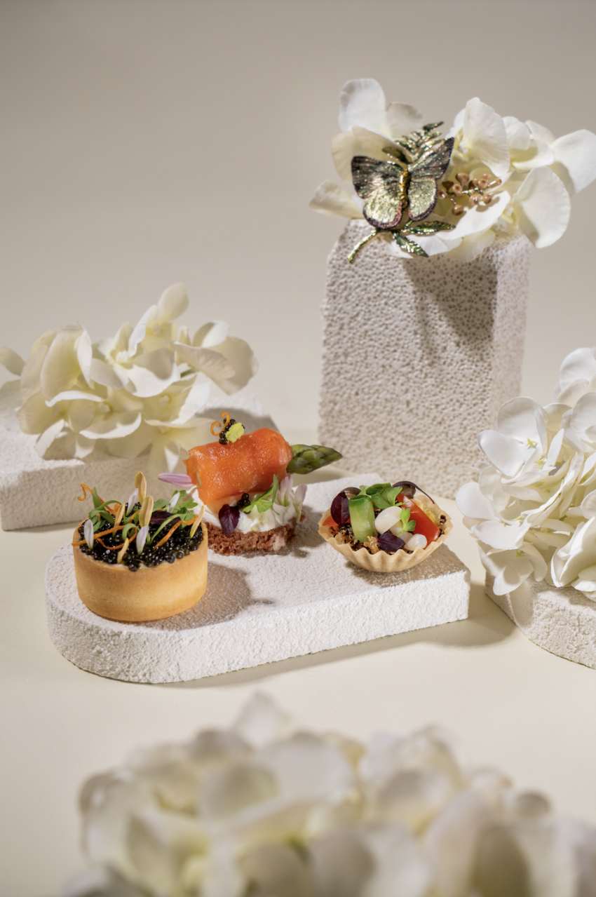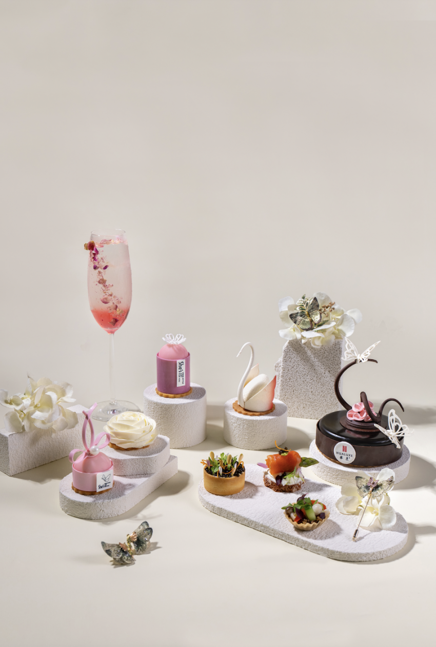 活动现场,以SHE'S蝴蝶为灵感的联名下午茶惊艳亮相,茉莉风情慕斯、开心果白巧覆盆子慕斯、烟熏三文鱼芦笋卷等五款甜点与三款咸点宛如可食用的艺术品,将春日的灵动与女性的柔美诠释得淋漓尽致;搭配玫瑰气泡特饮,色泽粉润通透,玫瑰芬芳与气泡的清爽感相得益彰,为春日午后增添了一抹灵动气息。