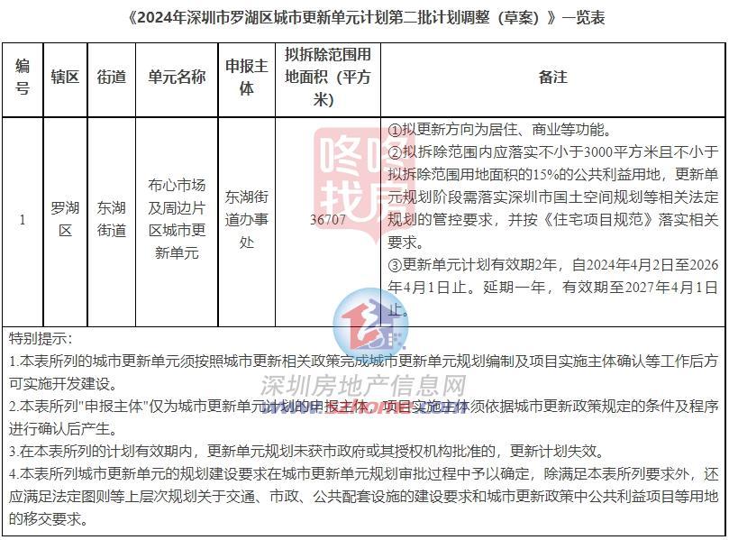罗湖区东湖街道布心市场及周边片区城市更新单元于2024年4月列入《2024年深圳市罗湖区城市更新单元计划第二批计划》,现拟开展更新计划调整,调整内容为公共利益用地面积和计划有效期等。