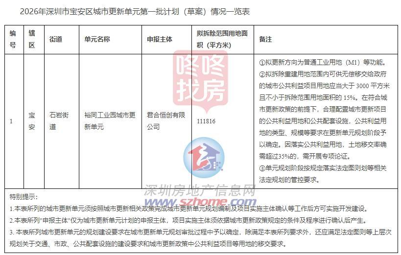 在这之前,宝安公示了今年第一批旧改计划(草案),宝安裕同工业园城市更新单元入列计划,该项目拟拆除范围达111816平方米。