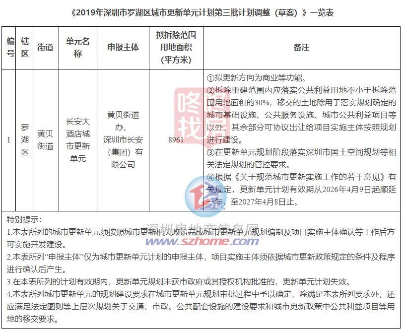 罗湖区黄贝街道长安大酒店城市更新单元于2019年9月列入《2019年深圳市罗湖区城市更新单元计划第三批计划》,现拟开展更新计划调整,调整内容为拟拆除范围、公共利益用地面积及计划有效期等。